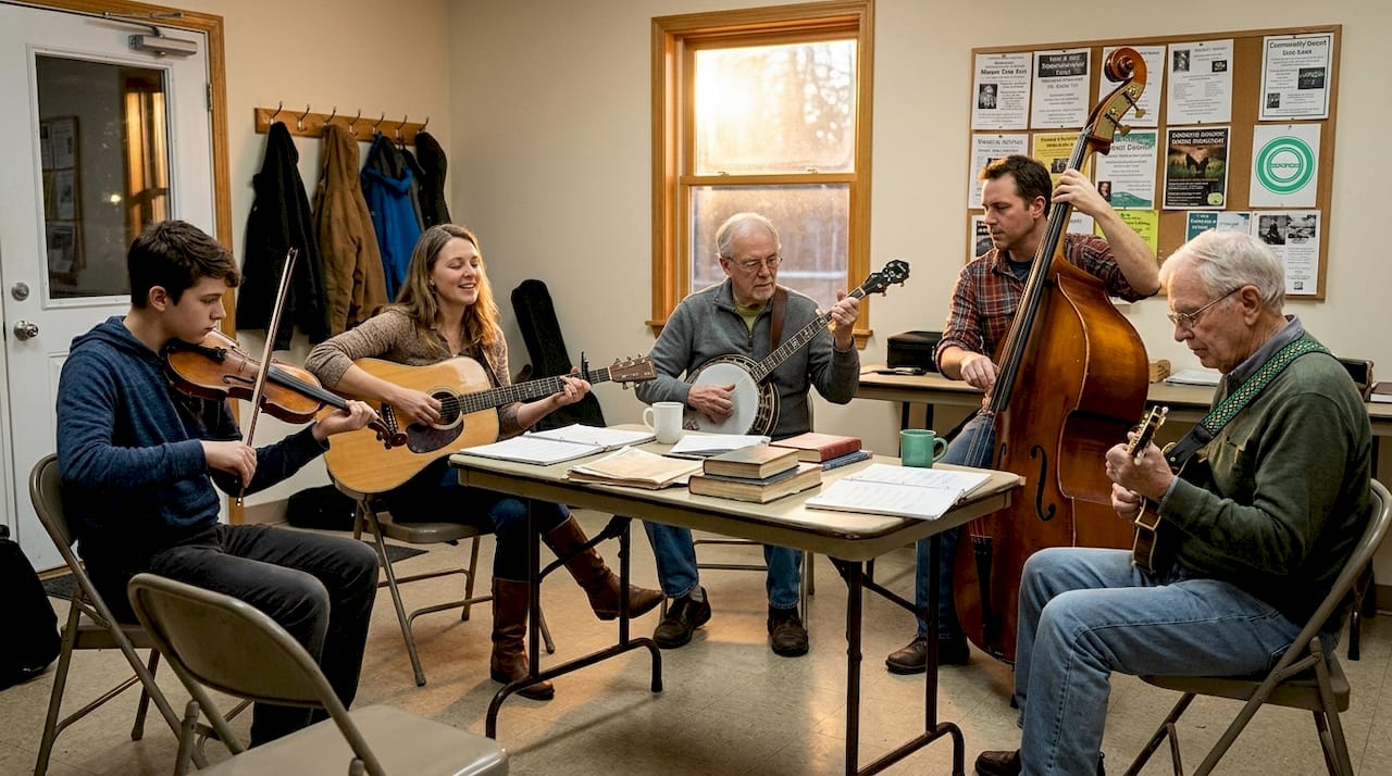 Folk jams tend to be tune-based rather than chord-based. Players learn a shared repertoire of melodies and then improvise within that framework. It's less about soloing and more about weaving your voice into a collective sound. The acoustic focus also means dynamics matter more. You can't hide behind volume.