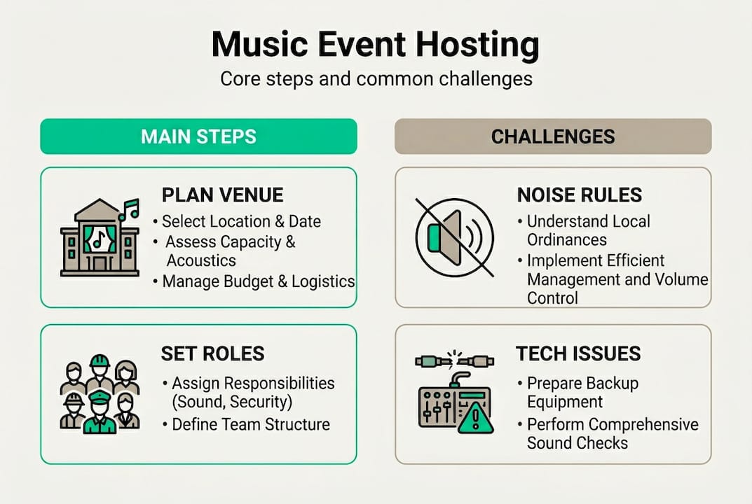 The good news: you don't need to be a professional promoter to pull it off. Musicians, fans, and community organizers all host successful events every week. What separates a smooth event from a chaotic one usually comes down to preparation. As the core responsibilities show, venue selection, artist booking, budgeting, promotion, and logistics are the building blocks every host needs to address.