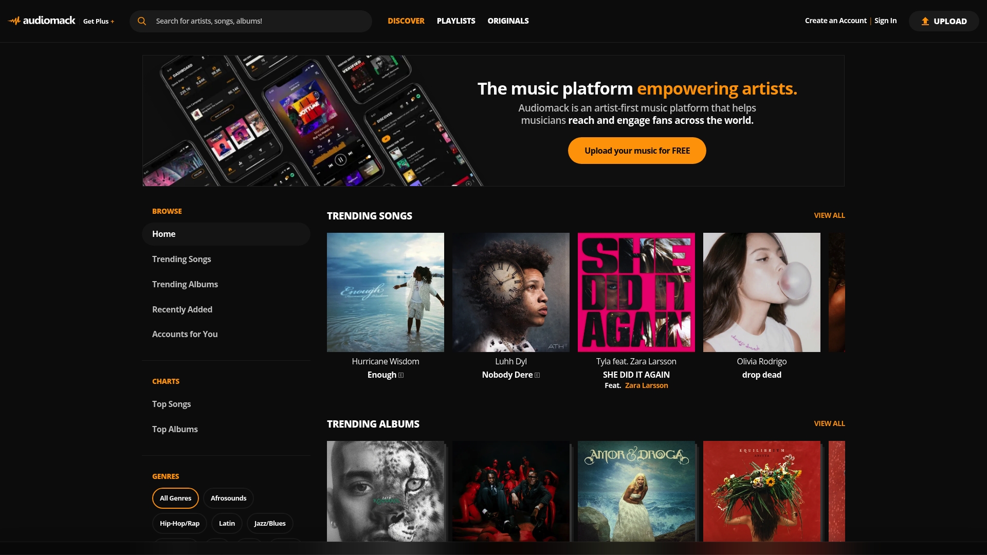 | Audiomack | Music uploads<br>Trending charts<br>Curated playlists | Unlimited uploads<br>Listener-friendly discovery options<br>Premium offline downloads | Ads in free tier<br>Premium required for HiFi playback | Free tier; Premium option for $4.99/mo |