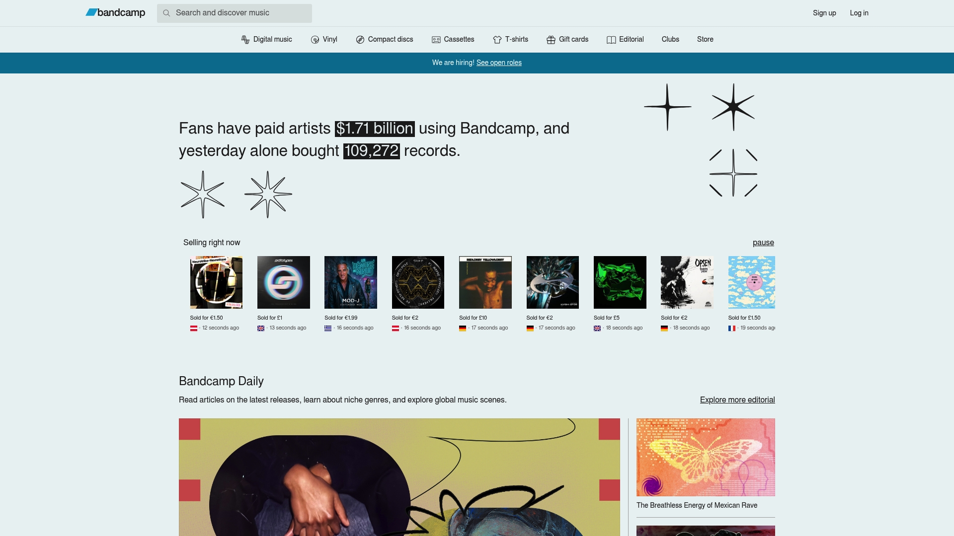 Bandcamp is a marketplace where independent artists sell music and merchandise directly to fans. It pairs digital and physical sales with editorial features and monthly payout options to help artists earn and connect with listeners.